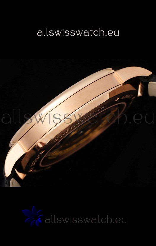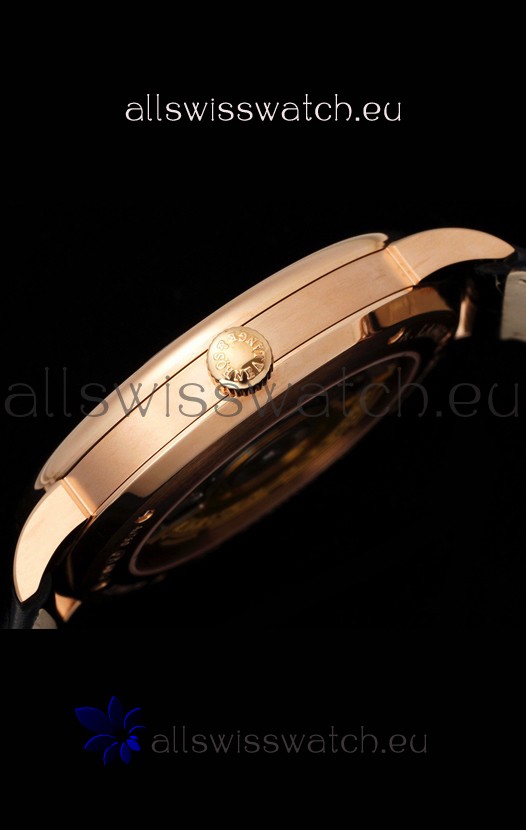 18K Rose Gold Plating on 904 Polished Solid Stainless Steel Case with Open Case Back Cover in Steel. Polished Bezel.