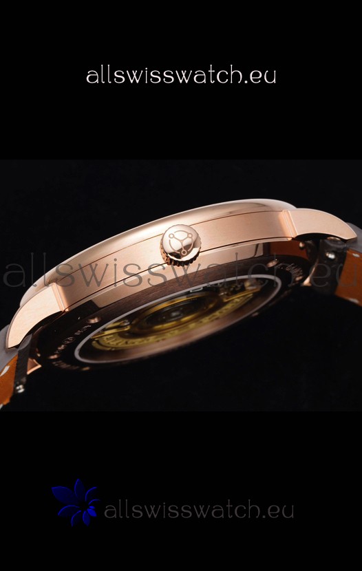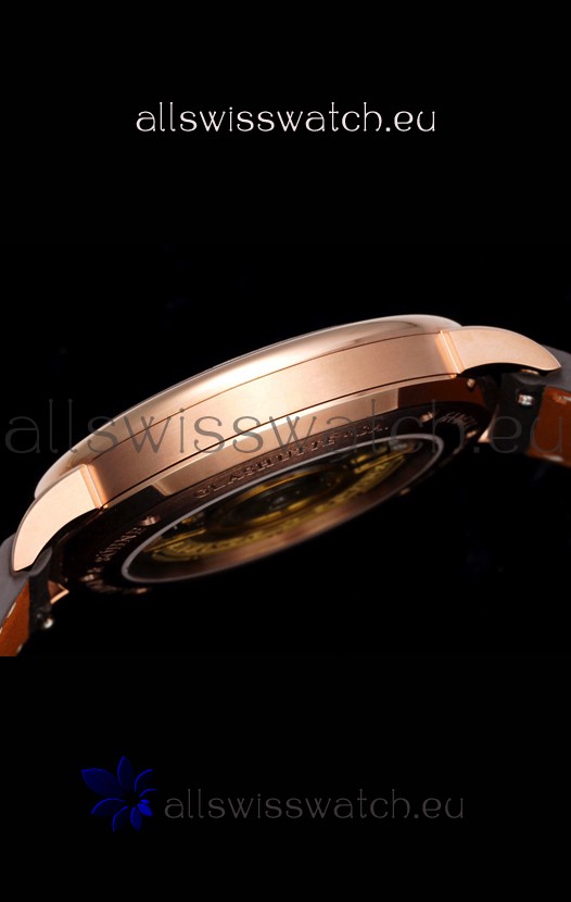 18K Rose Gold Plating on 904 Polished Solid Stainless Steel Case with Open Case Back Cover in Steel. Polished Bezel.