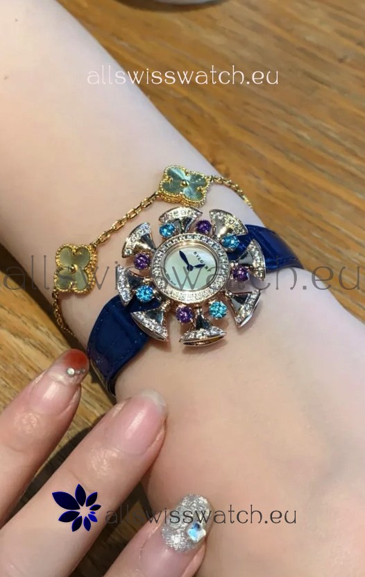 Diamonds Bezel with Colored Sapphires. Mother of Pearl Dial
