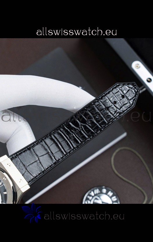 Hybrid Leather/Rubber Strap with Stainless Steel Folding Clasp complete with Hublot Markings and Engravings.