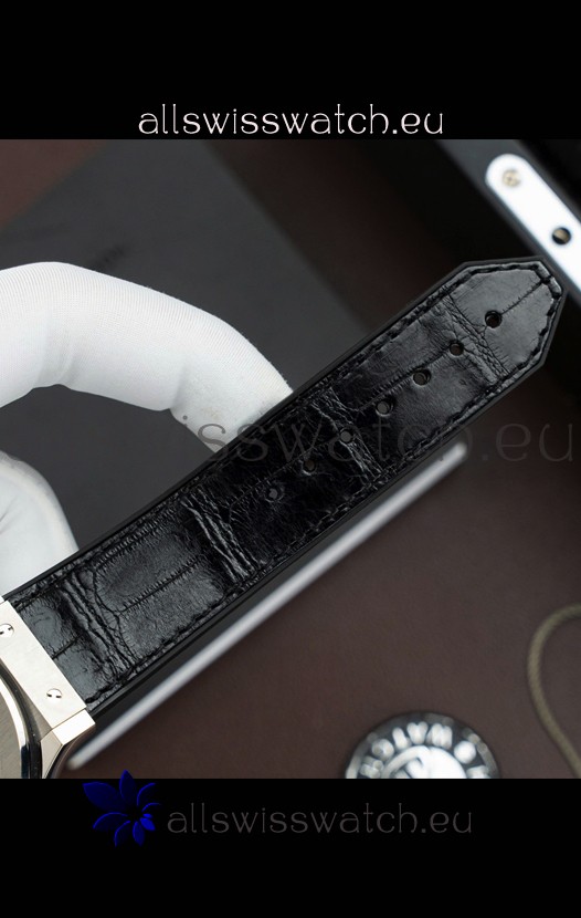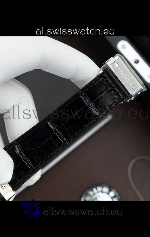Genuine Hybrid Leather/Rubber Clad Strap with Stainless Steel Folding Clasp complete with Hublot Markings and Engravings.
