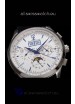 White Dial with Day/Date Indicator at 12 O'Clock, Date Counter, Day of Week Counter and 12/24 hours counter with Day and night Moon Phase Indicator.