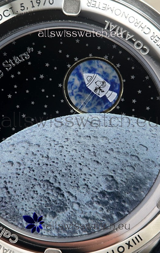 The Globe Located at the rear would rotate and complete one revolution per Minute, the Snoopy on Spaceship would rotate counter clockwise in conjunction to the Chronograph second hand once the Chronograph feature is activated.