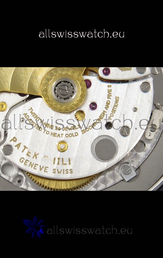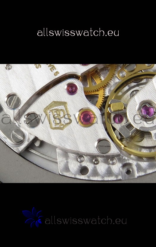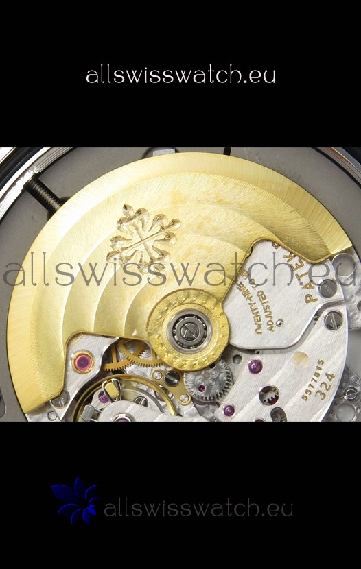 Genuine Swiss 9015 Movement assembled to Resemble the Authentic Patek Philippe PP 324 CS Calibre Style Movement. Updated Rotor, Bridged and Engravings on Movement.