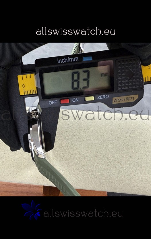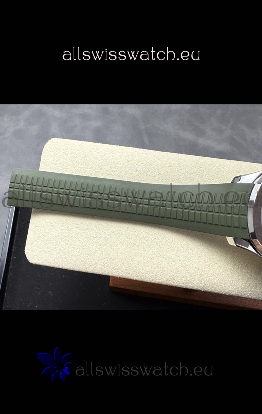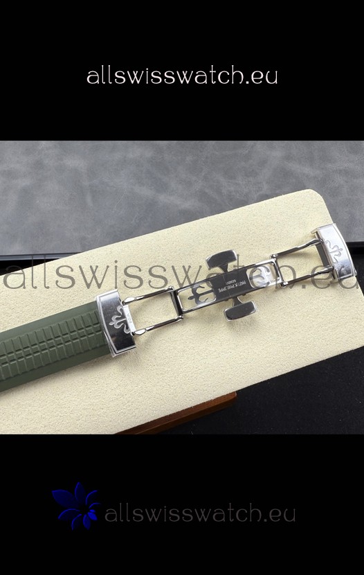 Green Curved Rubber Strap with Steel Folding Clasp complete with Patek Philippe Markings. A Highly Updated Clasps for this series with much more accurate markings/engravings.