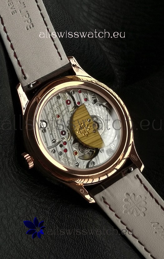 Genuine Swiss 9015 Movement assembled to Resemble the Authentic Patek Philippe PP 324 Calibre Style Movement. Updated Rotor, Bridged and Engravings on Movement with Rose Gold Plated Patek Philippe Stamped Rotor
