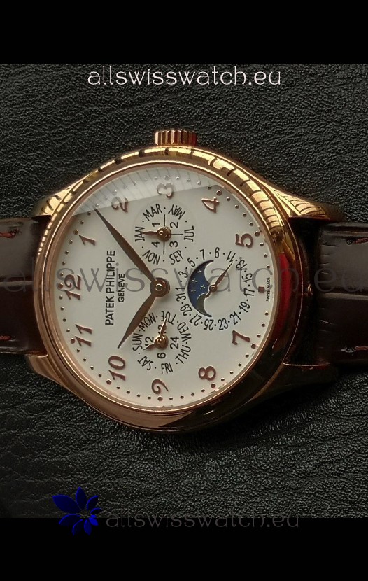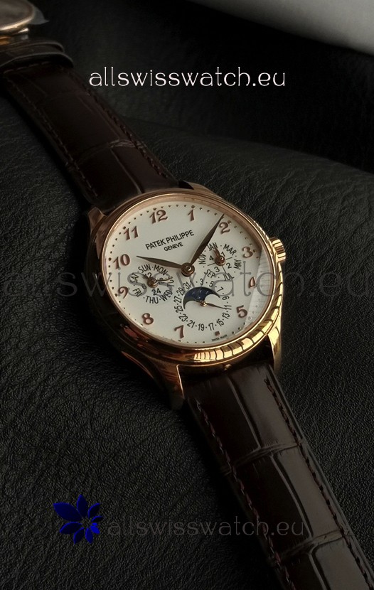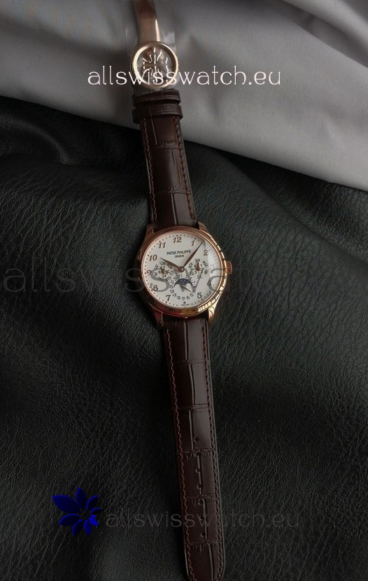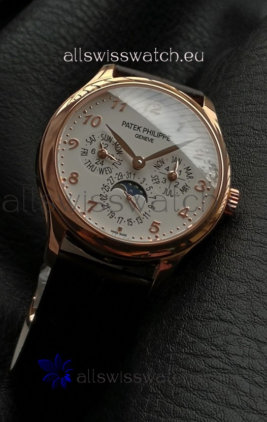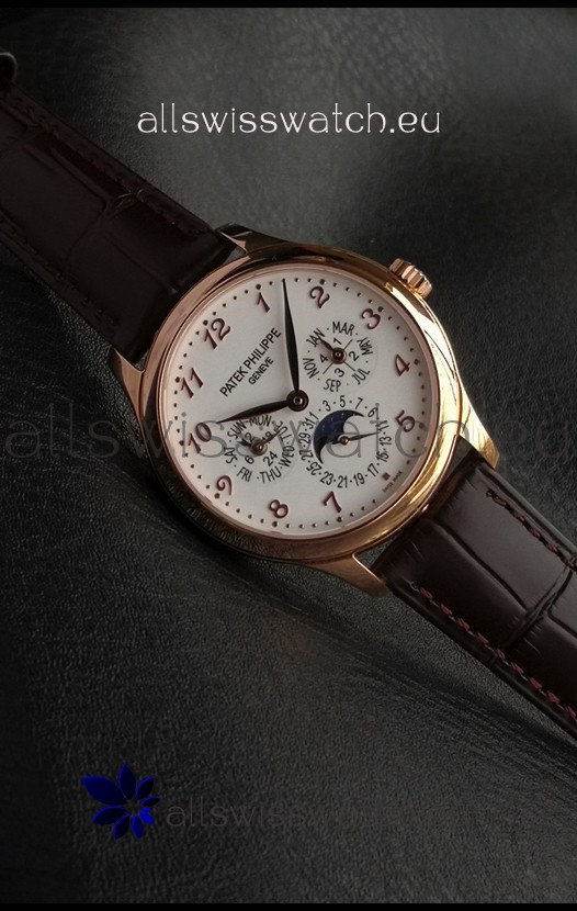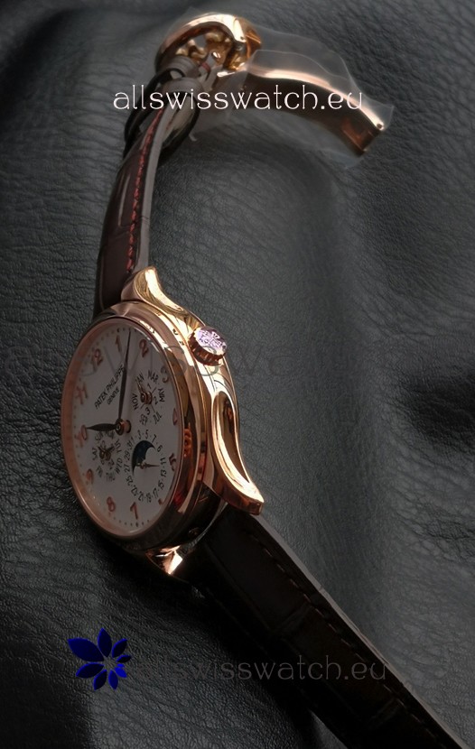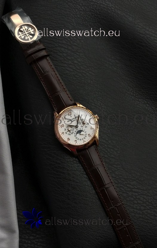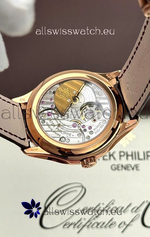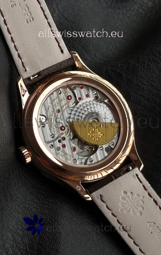 Genuine Swiss 9015 Movement assembled to Resemble the Authentic Patek Philippe PP 324 Calibre Style Movement. Updated Rotor, Bridged and Engravings on Movement with Rose Gold Plated Patek Philippe Stamped Rotor
