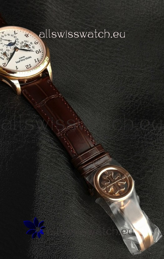 Genuine Leather Strap with Rose Gold Plated Folding Clasp complete with Patek Philippe Markings.