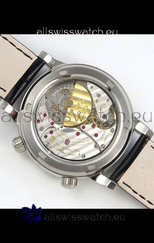 Genuine Swiss 9015 Movement assembled to Resemble the Authentic Patek Philippe PP 240 Calibre Style Movement. Updated Rotor, Bridged and Engravings on Movement with Rose Gold Plated Patek Philippe Stamped Rotor