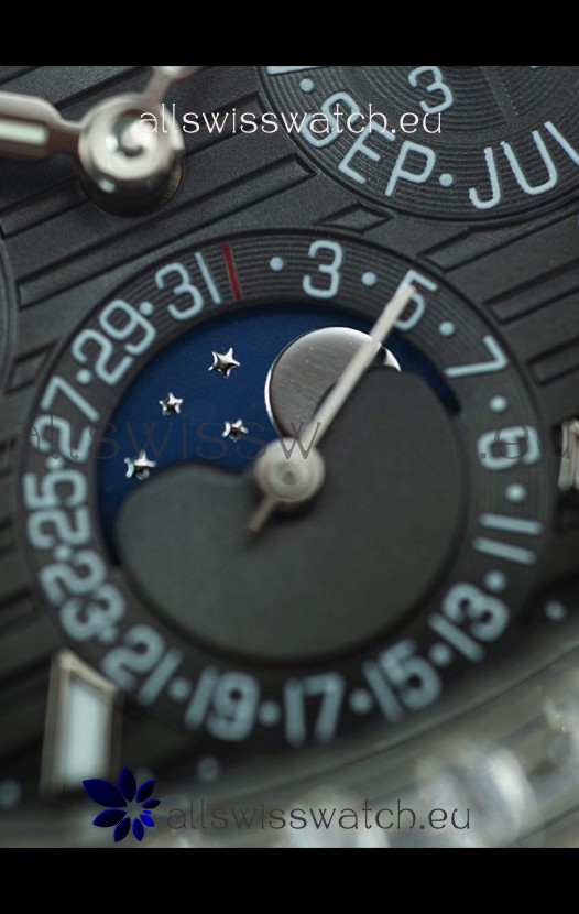 Grey Dial with 3 Functional Sub Dials as Day, Month and Date Indicators. Moonphase Functions as Day and Night Feature
