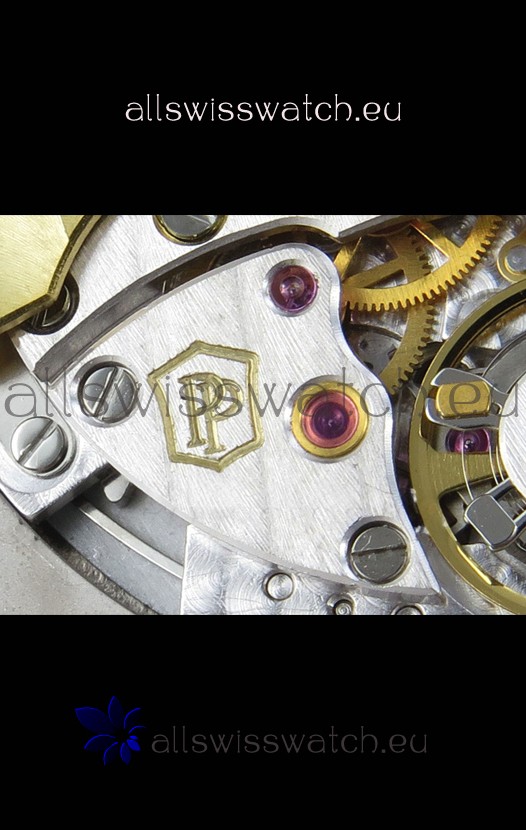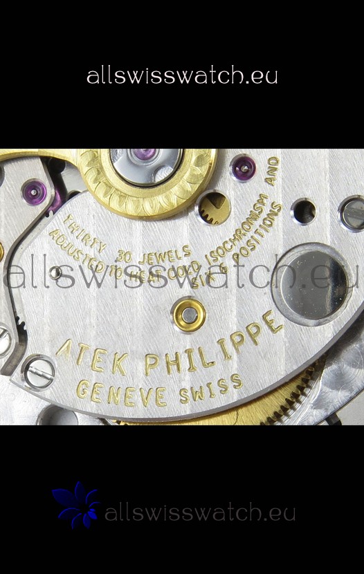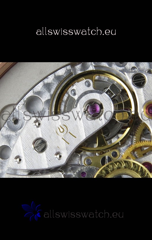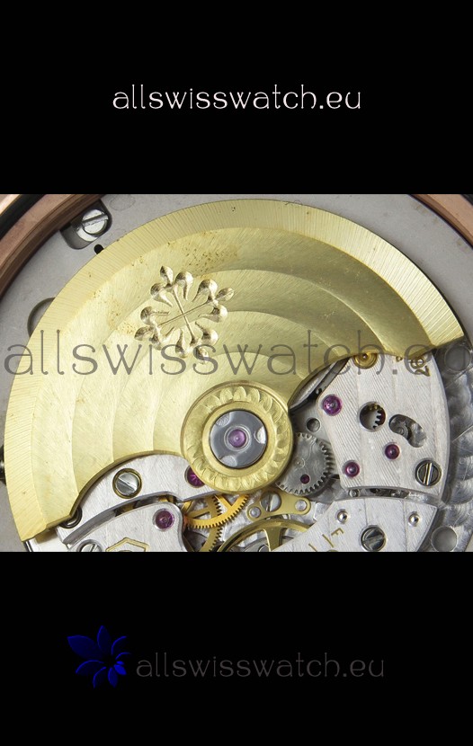 Genuine Swiss 9015 Movement assembled to Resemble the Authentic Patek Philippe PP 330 CS Calibre Style Movement. Updated Rotor, Bridged and Engravings on Movement.