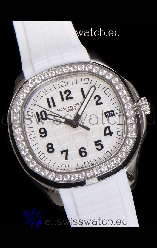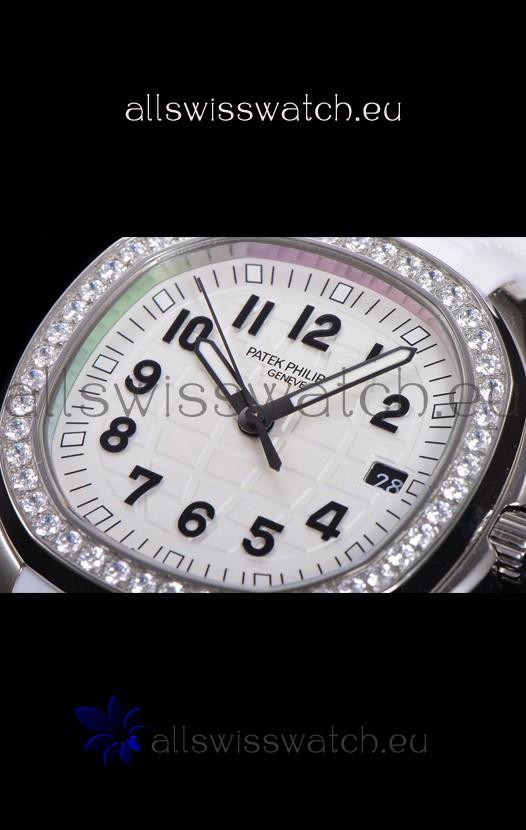 White Colored Textured Dial with Date Window at 3 O'Clock. Diamonds Bezel
