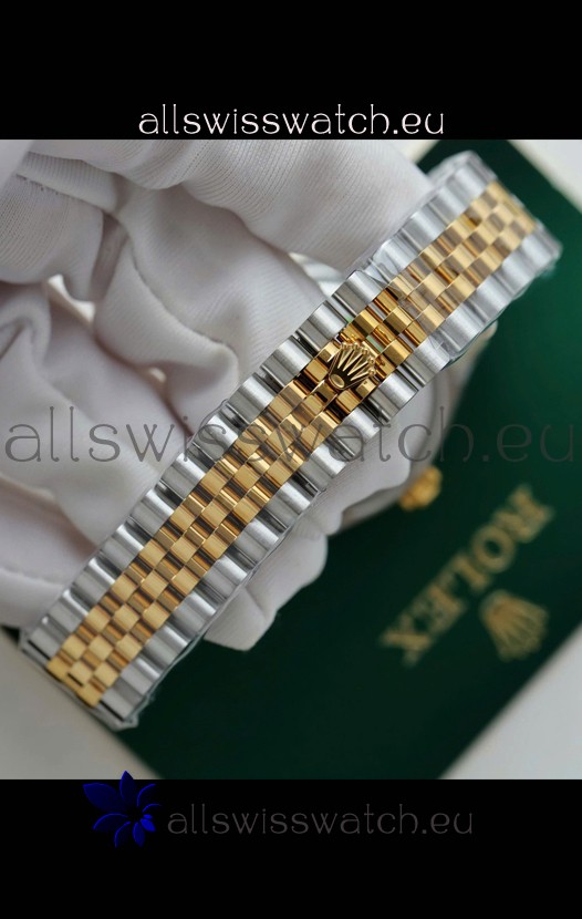 18K Yellow Gold Plating on 904L Stainless Steel Two Tone Strap with New Style Rolesor Deployant Buckle, End links match up Flush with the Case. - A Much Improved Datejust Strap Version