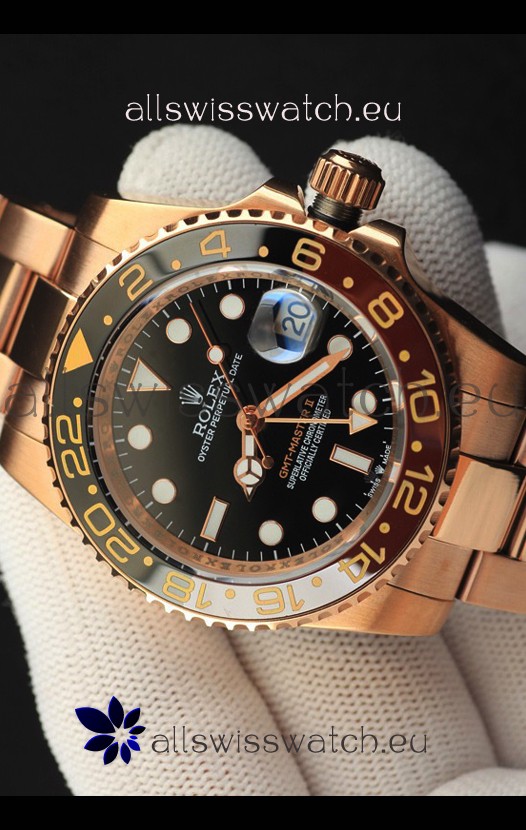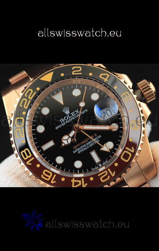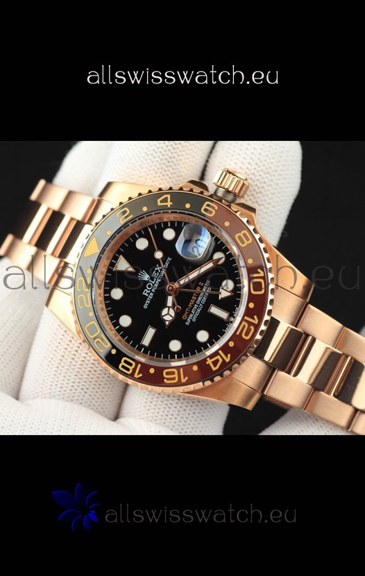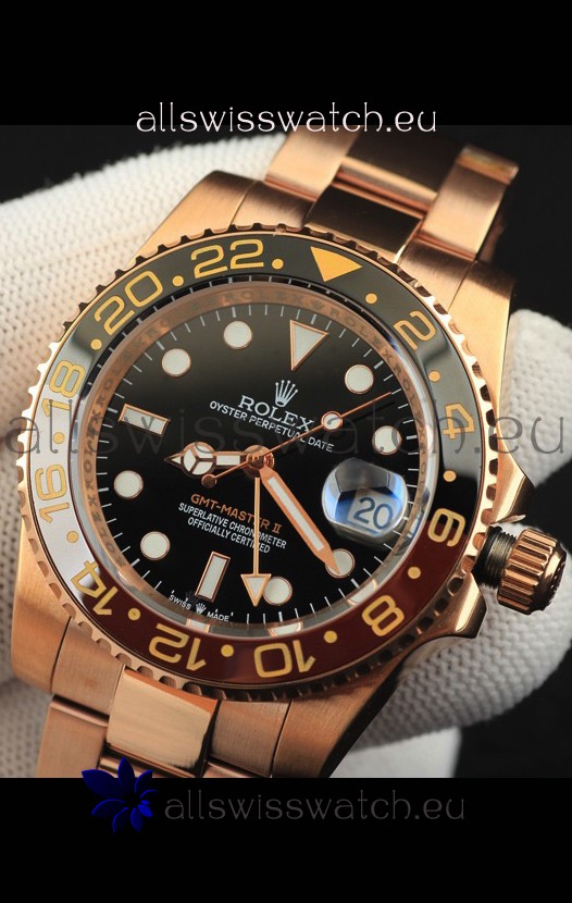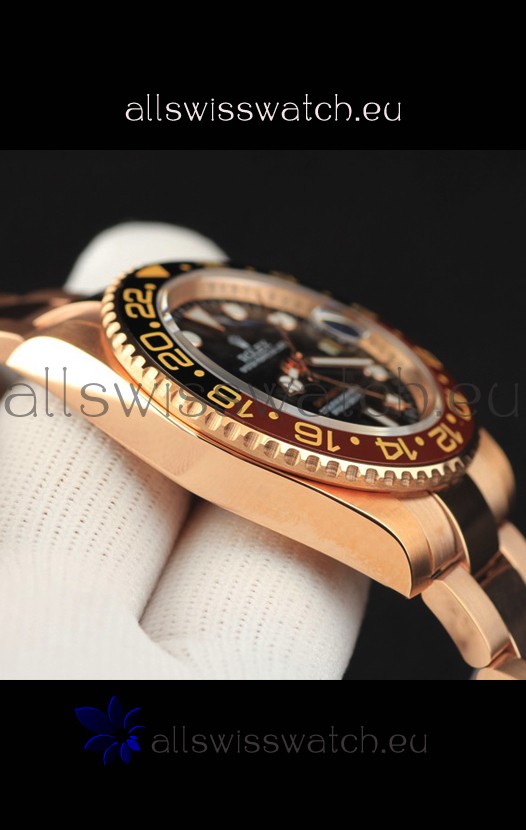 You're reviewing: Rolex GMT Masters II Rose Gold Plating Japanese Replica Watch Black Dial